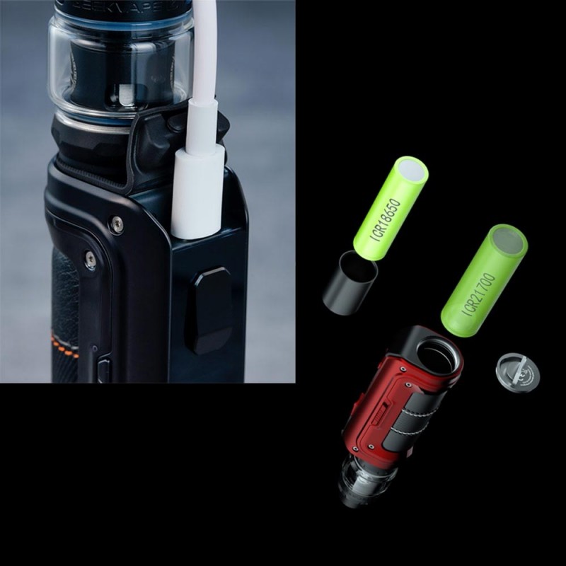 Der Akku wird über einen Schraubverschluß am Boden des Aegis Max 2 Mods eingelegt, wobei dieser nochmals besonders abgedichtet wurde. Mit der mitgelieferten Hülse lassen sich auch 18650-Akkus verwenden, mit einem 21700-Akku holt man aber am meisten Performance und Ausdauer aus dem Akkuträger. An der Oberseite ist ein - ebenfalls durch eine Silikonlasche abgedichteter - moderner USB Typ-C-Anschluß zu erreichen, über den der Aegis Max 2 Mod Akkuträger mit bis zu 2A geladen werden kann (QuickCharge).