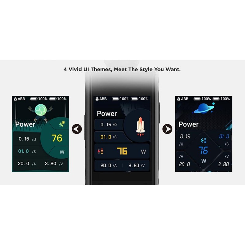 Neben einem klassischen VW-Modus (Powermodus) sowie einem intelligenten SMART-Modus mit automatischer Ermittlung des Leistungsbereichs je eingesetztem Coil sind auch "Profi-Modi" wie ein Curve-Modus (VPC), vorkonfigurierte Temperaturmodi für verschiedene Drahtarten, einen individuell konfigurierbarer Temperaturmodus sowie eine Bypass-Funktion mit an Bord. Ein Hingucker ist das große 2,4" Touch-Farbdisplay, das sich über die gesamte Vorderseite des Mods erstreckt. Zur Individualisierung stehen 4 verschiedene, dynamische UI-Themes, diverse Wallpaper oder auch eine manuelle Helligkeitsregulierung zur Auswahl. Auch ein Zugzähler ist mit an Bord.