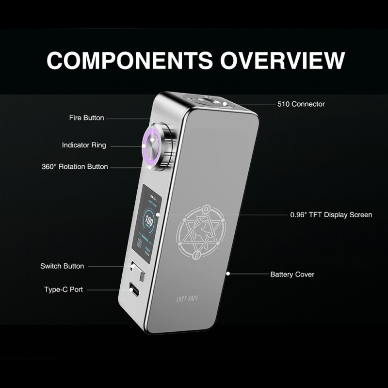 Der Centaurus M100 Box Mod von Lost Vape präsentiert sich als kompakter Akkuträger für eine einzelne 18650er Akkuzelle. Mit Abmessungen von nur 92.7 x 38.0 x 26.0 mm und einem Gewicht von etwa 100 g liegt der Centaurus M100 angenehm in der Hand. Sein hochwertiges Gehäuse aus Aluminium-Legierung verleiht ihm eine erstklassige Haptik, während sein modernes Design durch gute Ergonomie besticht. In acht verschiedenen Farbvarianten erhältlich, zieht dieser schicke Mod bewundernde Blicke auf sich. Die aufwendig gestalteten Seitencover (mit Pentagramm, Centaurus Logo und Schriftzug), die magnetisch am Mod befestigt sind, können bei Bedarf gegen weitere Cover aus dem Zubehör ausgetauscht werden. Der Centaurus M100 ist in der Lage, Verdampfer bis zu einem Durchmesser von 26.0 mm auf seinem gefederten 510er-Anschluss aufzunehmen.