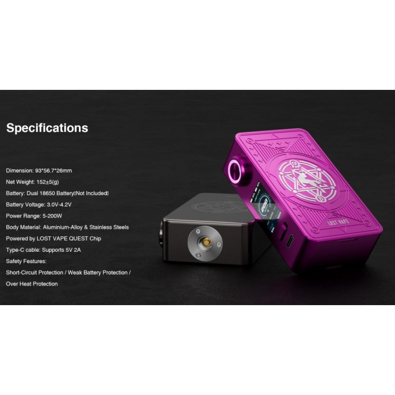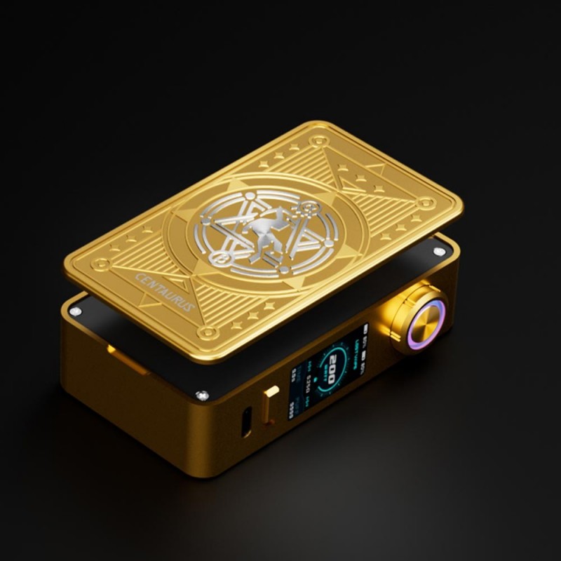 LostVape stellt mit dem Centaurus M200 Mod einen modernen Akkuträger für zwei 18650 Akkus vor, der mit einem imposanten Erscheinungbild und einer beeidruckenden Optik auftritt. Je nach Version ist das magnetische Seitencover, dass zugleich die Akkuabdeckung darstellt, mit verschiedenen Mustern sowie einem Pentagramm und dem stilisiertem Centauren-Logo und Schriftzug aufwendig verziehrt. Die Front dominiert das große Farb-TFT-Display sowie der ergonomische Feuertaster mit 360° LED. Hergestellt aus Edelstahl und einer Zinklegierung überzeugt der Centaurus M200 Mod auch mit einem für die Größe geringen Gewicht und einer wertigen Haptik.