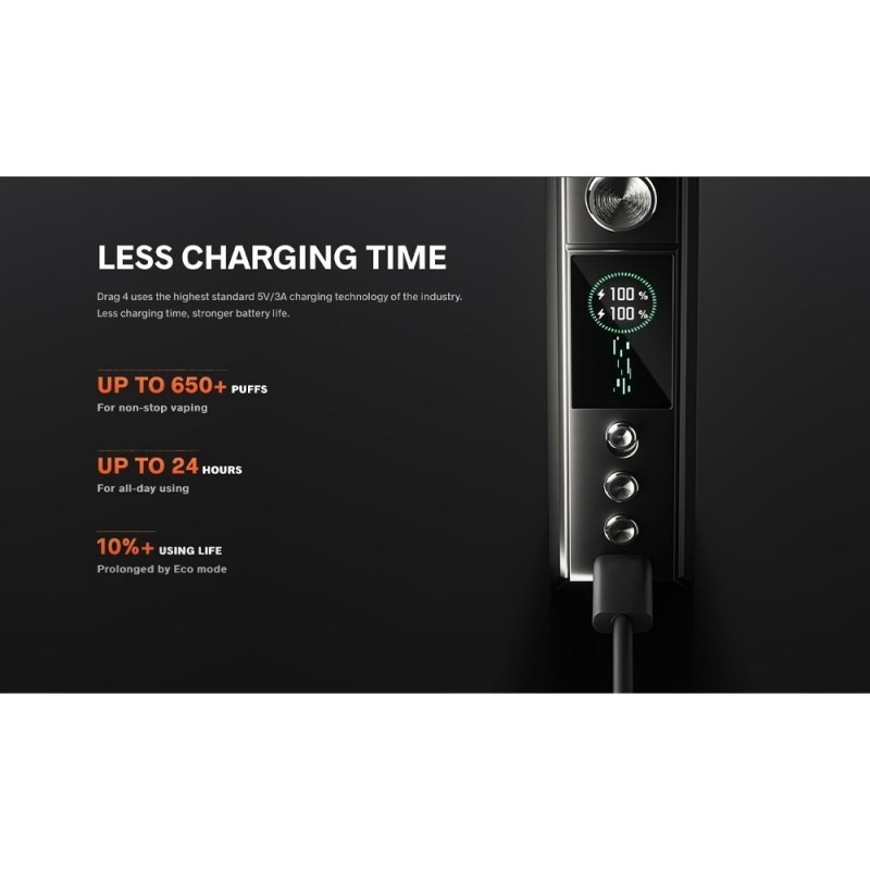 Der Drag 4 Mod Akkuträger wird von zwei 18650-Akkus (nicht enthalten) angetrieben und bietet eine Maximalleistung von 177 Watt. Der hauseigene und äußerst effiziente GENE.TT 2.0 Chipsatz wurde nochmals überarbeitet und bringt einige Neuerungen mit. Der Drag 4 Mod Akkuträger bietet insgesamt 4 Modi: Ein SMART-Modus erkennt den eingesetzten Coil und stimmt die Leistung automatisch optimal auf diesen ab. Dabei wird zusätzlich eine Leistungsobergrenze zum Schutz der Coils festgelegt, über die der Nutzer nicht hinaus kann. Im Gegenzug dazu bietet der RBA-Modus dem Nutzer alle Freiheiten bei den Leistungseinstellungen. Ein ECO-Modus unterstützt energieeffizientes Dampfen. Dieser wird unabhängig von einer manuellen Auswahl von der Box ab einer Akkugrenze von 20% dem Nutzer automatisch angeboten. Zu guter Letzt hat Voopoo dem Drag 4 Mod Akkuträger auch wieder einen TC-Modi spendiert, der das temperaturgesteuerte Dampfen für Nickel-, Edelstahl- und Titan-Wicklungen ermöglicht.