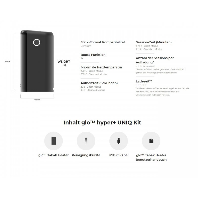 Mit dem neuen Glo Hyper+ UNIQ ist der Tabakgenuss nur ein Knopfdruck entfernt: glo™ hyper+ UNIQ ist der Nachfolger des glo™ hyper+. Mit dem glo™ Gerät kannst du bereits nach 30 Sekunden deine Session starten. Erlebe im Boost Modus die bislang kürzeste Erhitzungsdauer: Nach 20 Sekunden ist dein Device ready. Genieße bis zu vier neo™ sticks* ohne Zwischenladezeit. Eine Session dauert 4 Minuten. Der Akku Deines glo™ hyper+ UNIQ hält für ca. 22 Sessions und lässt Dich den ganzen Tag nicht im Stich.