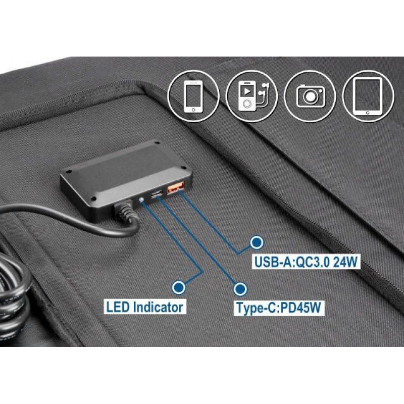 Das Golisi GL200P Solarpanel besitzt Standardanschlüsse, die für die Verwendung mit den meisten Powerbanks und Solargeneratoren auf dem Markt ausgelegt sind. Darüberhinaus stehten Dir aber auch zwei USB-Anschlüsse zur Verfügung (USB-A, USB-C), an denen Du einen Verbraucher direkt an das Solarpanel anschließen und aufladen kannst. Zu guter Letzt liegen dem Lieferumfang noch drei DC-Adapter mit bei, die zum direkten Aufladen elektrischer Verbraucher geeignet sind (12V-18V).