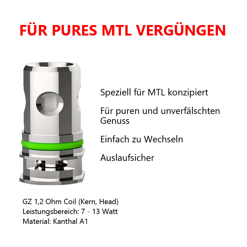 Beim GZeno Tank kommen die GZ Coils von Eleaf zum Einsatz. Diese sind auf MTL-Genuss eingestellt und bringen einen unverfälschten und reinen Geschmack im unteren Leistungsbereich zum Vorschein. Mit 1,2 Ohm Widerstand und einem Leistungsbereich von 7-13 Watt bringen sie typische MTL-Eigenschaften mit.