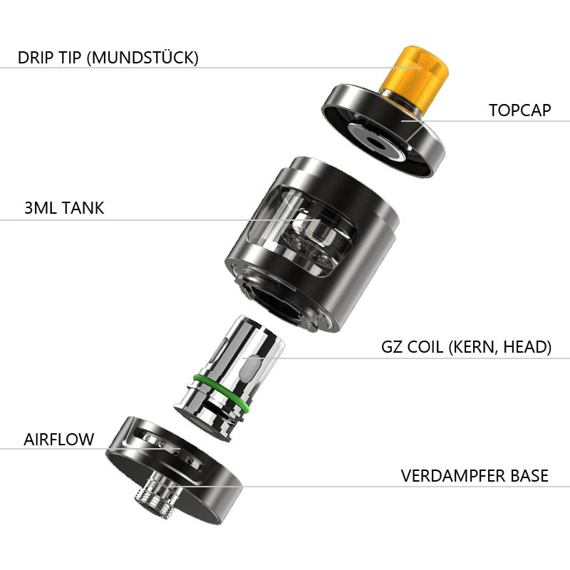 Der GZeno Tank umfasst ein Volumen von 3ml. Befüllt wird er ganz simpel von oben (TopFilling). Den Füllstand hat man dank der Sichtfenster immer im Blick. Auch der Kernwechsel gestaltet sich einfach, die Kerne werden einfach von unten reingesteckt. Damit bietet sich der GZeno Tank als einfach zu bedienender Alltagsverdampfer an.