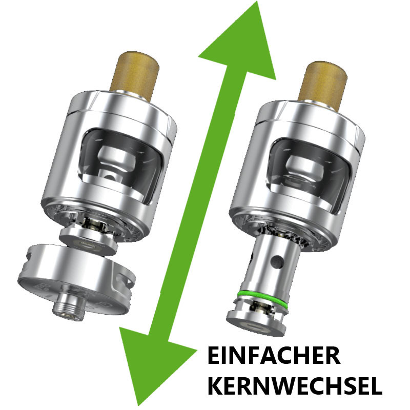 Bei Kernwechsel neuen Kern an den seitlichen Liquidzufuhrlöcher mit Liquid befeuchten. Dann Liquid einfüllen und 10 min. warten, damit sich neuer Kern mit Liquid füllen kann. Wir empfehlen, den neuen Kern auf niederiger Leistung 5 Züge einzudampfen und nicht gleich mit Vollgas loszulegen.
