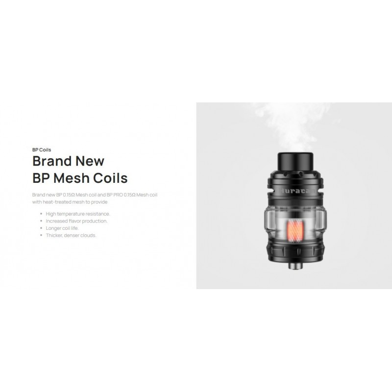 Der Huracan Tankverdampfer ist optisch wie auch von der Leistung perfekt auf den Rhea Mod Akkuträger abgestimmt und macht seinem Namen alle Ehre. Der eindrucksvolle Tankverdampfer mit 26mm Durchmesser an der Base entfesselt in Verbindung mit den BP Coils von Aspire einen wahren Orkan - sowohl geschmacklich wie auch von der Dampfmenge- und Dichte bewegt er sich auf oberem Niveau. Neben den aus anderen Verdampfern bereits bekannten BP Mesh Coils mit neuester Meshtechnik und Widerständen von 0,5 und 0,17 Ohm hat Aspire speziell für den Huracan Tankverdampfer einen BP Mesh Coil mit 0,15 Ohm sowie einen BP Mesh Coil Pro mit 0,15 Ohm vorgestellt, die bei Leistungen von 60-80 Watt bzw. 80-100 Watt verwendet werden.