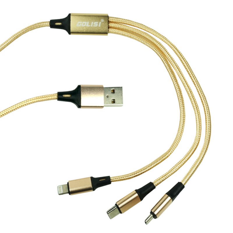 Golisi bietet mit dem USB Ladekabel ein funktionales und langlebiges Ladekabel an, mittels dem man 3 unterschiedliche Arten von Anschlüssen bedienen kann. Es können sowohl Geräte mit klassischen Micro-USB-Anschluß, mit dem neuen USB Typ C-Anschluß oder Geräte von Apple mit dem Lightning-Anschluß geladen werden.