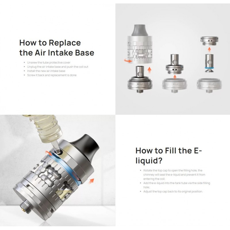Die Air Intake Bases werden mit dem Coil dank einfachem Push'n'Pull-Prinzip schnell und einfach gewechselt, was auch für den Coil an sich gilt. Man entnimmt einfach den Coil samt Air Intake Base und tauscht den Coil und/oder die Air Intake Base und setzt sie wieder gemeinsam in die Base.