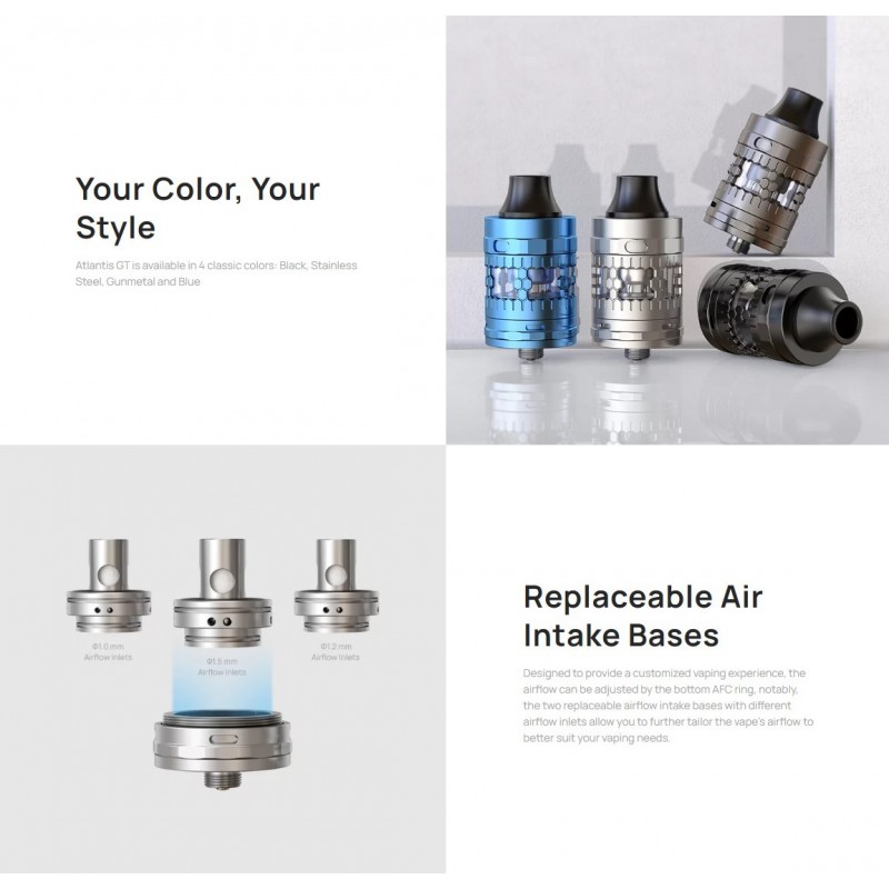 Unten an der Base des AGT Tankverdampfers befindet sich die AirFlow-Control, die durch Drehung eine individuelle, stufenlose Anpassung der Luftzufuhr ermöglicht. Eine weitere Besonderheit des AGT Tankverdampfers betrifft eine zusätzliche Einstellmöglichkeit der Luftzufuhr über die sogenannte Air Intake Base. Diese befindet sich unterhalb des Coils und kann ausgetauscht werden. Es stehen drei verschiedene Air Intakes Bases mit je 4 paarweise angeordneten, unterschiedlichen Bohrungen zur Verfügung (ID1,0mm, ID1,2mm, ID1,5mm), die nochmals einen Einfluß auf das Zugverhalten und den Zugwiderstand nehmen und immer eine optimale Anströmung der Luft auf den Coil garantieren.