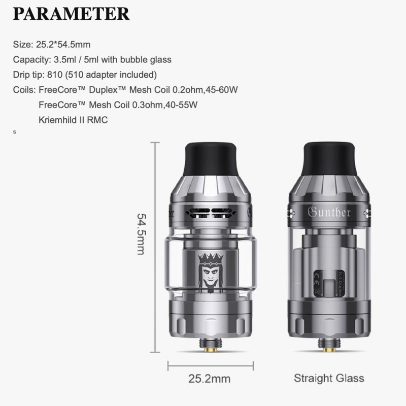 Der Gunther Clearomizer repräsentiert einen weiteren Subohm-Verdampfer aus dem Hause Vapefly. Die beigefügten Verdampferköpfe, nämlich der FreeCoreTM DuplexTM 0.2 Ohm und der FreeCoreTM 0.3 Ohm Mesh Head, ermöglichen ein direktes Inhalieren in die Lunge. Da es sich bei den Heads um Verschleißteile handelt, wird empfohlen, sie regelmäßig auszutauschen. Beim Dampfen im Subohm-Bereich ist es ratsam, die eingebaute Top-Airflow Control vollständig zu öffnen.