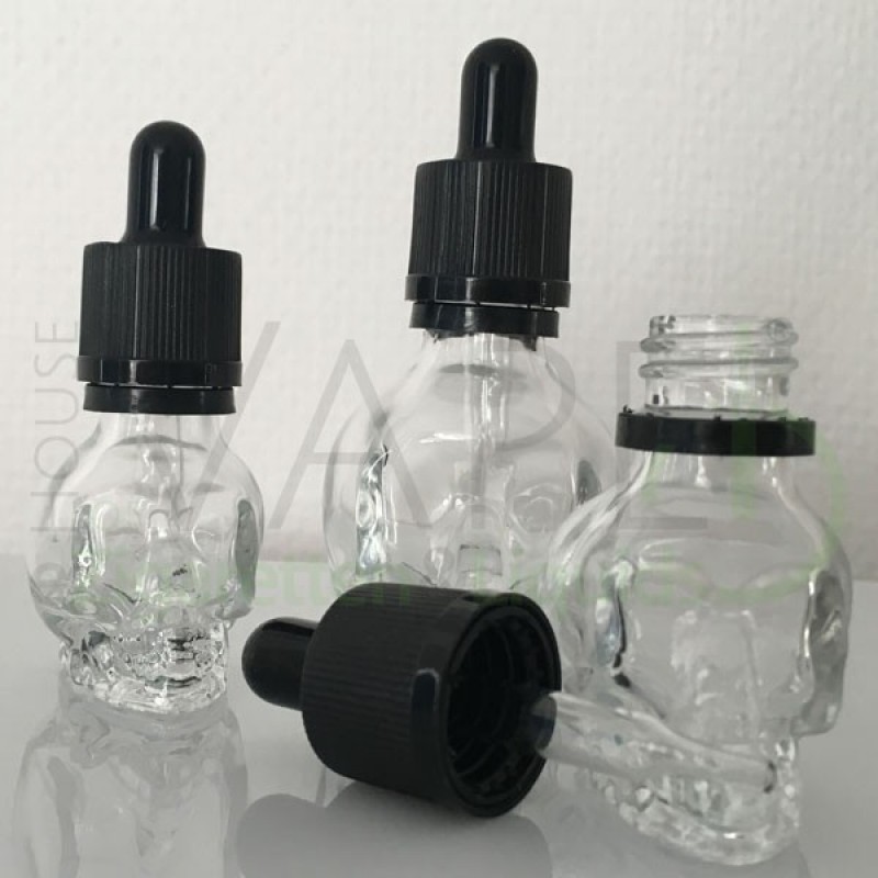 Hier erhälst Du leere Glasflaschen im coolen "Skull-" Design. Diese Flasche präsentiert Dein Liquid in ganz besonderem Glanz. Der Totenkopf wird garantiert alle Blicke auf sich ziehen. Die Flasche erhälst Du 3teilig (Glasflaschenkörper, Deckel, Glaspipette) und hat einen Sicherheitsverschluß (zum Öffnen Deckel etwas herunter drücken).