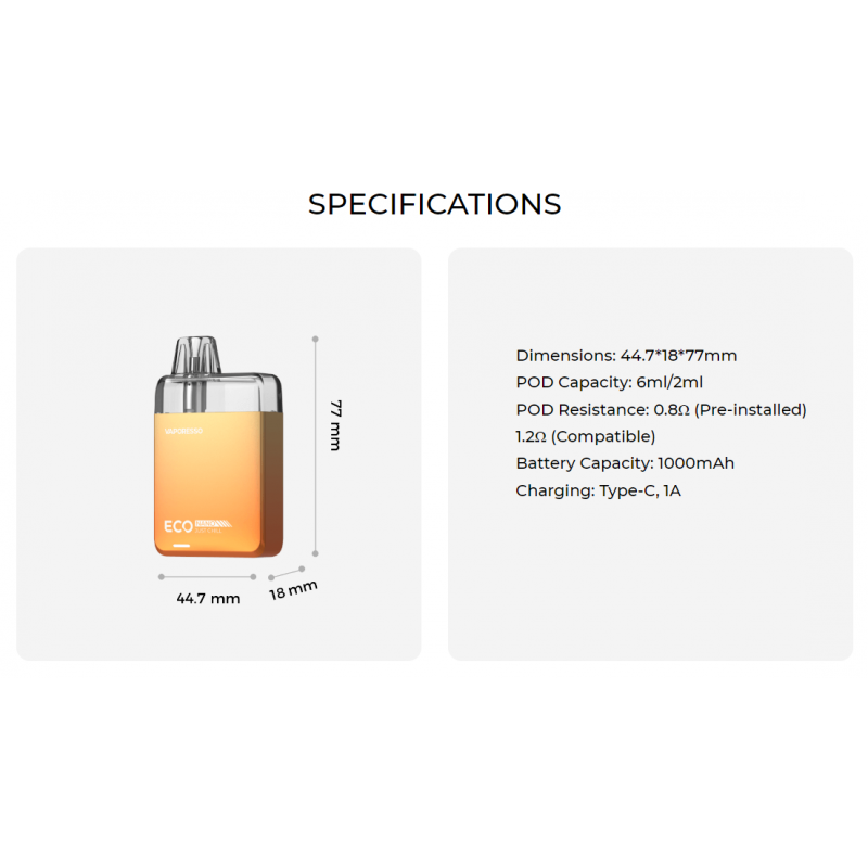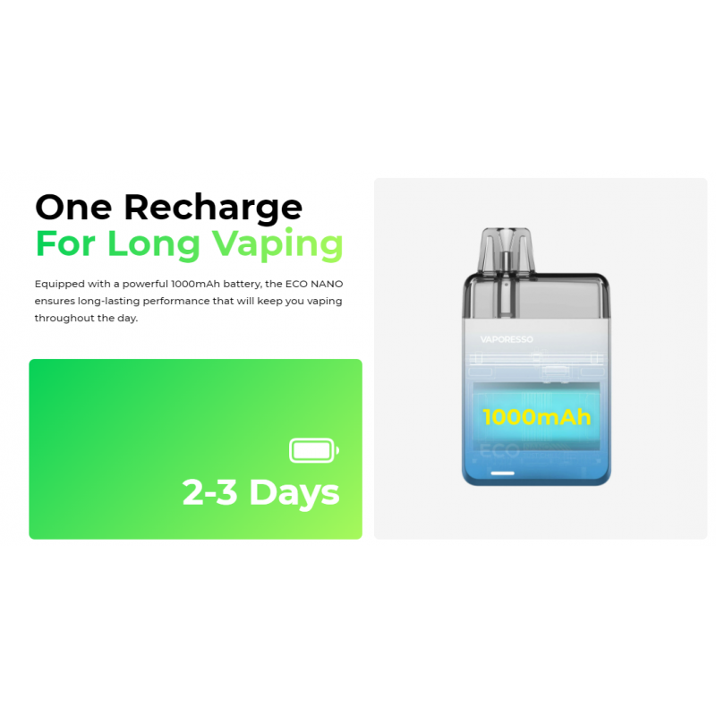 Das Eco Nano überzeugt mit einem schlanken Design und einer Auswahl an farbenfrohen Designs, die Deinen persönlichen Stil unterstreichen. Dank des integrierten 1000mAh-Akkus und der USB Typ-C Fast-Charging-Funktion kannst Du schnell wieder dampfen, ohne lange Wartezeiten in Kauf nehmen zu müssen.