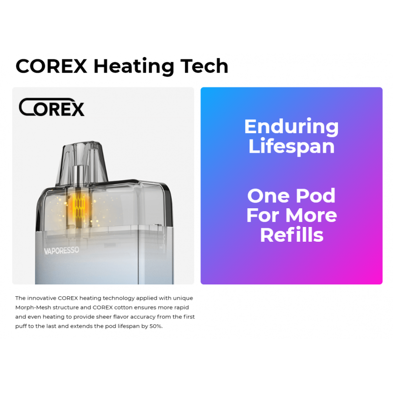 Der Eco Nano verwendet festverbaute Mesh Coils mit innovativer Corex Heating Tech und einer Morph-Mesh Struktur, was zu 50% effizienterem Verdampfen Deines Liquids führt. Das bedeutet 50% mehr Dampf und Geschmack sowie eine 50% längere Haltbarkeit der Coils. Dank der magnetischen Pod-Fixierung kannst Du die Pods mühelos austauschen.