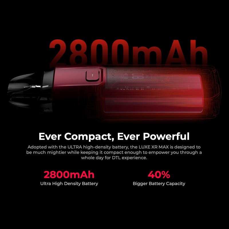 Das LUXE XR MAX Pod Mod ist mit einem 40% stärkeren Akku von 2800 mAh ausgestattet, der über den USB Typ-C Anschluss mit bis zu 2A schnell aufgeladen werden kann. Die Ausgangsleistung wurde in der MAX Version auf 80 Watt erhöht, sodass auch ein ungetrübtes DL Dampferlebnis möglich ist. Der moderne AXON Chip sorgt für Top-Performance und bietet umfangreiche Sicherheitsfeatures. Neben dem klassischen VW Modus gibt es auch einen intelligenten Smart Mode, der den Coilwiderstand automatisch erkennt und die optimale Leistung einstellt. Die Bedienung erfolgt über den ergonomischen Feuerbutton sowie zwei Up/Down Touch-Buttons auf dem Frontpanel. Alle relevanten Informationen wie Akkustand, Modus, Leistung und Puff-Counter werden auf dem brillanten 0.54 Zoll OLED Monochrom-Display angezeigt. Zwei pulsierende RGB LED Streifen an beiden Seiten des Frontpanels zeigen den Betriebsstatus, Akkustand und Ladefortschritt des Kits an. Die LED Beleuchtung kann bei Bedarf auch deaktiviert werden.