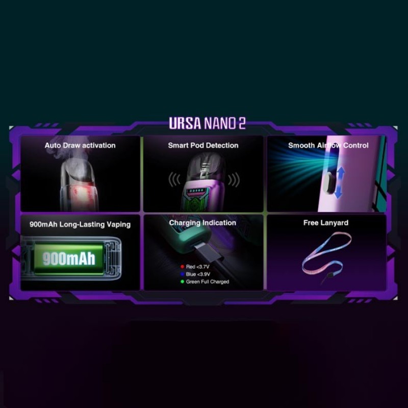 Besonders hervorstechend ist das Backlight des Podsystems, welches aus LEDs unter dem schimmernden Gehäuse besteht. Dieses Backlight erstrahlt in verschiedenen Farben und zieht definitiv die Aufmerksamkeit auf sich – ein wahrer Blickfang. Die intelligente Zugautomatik und die einfache Bedienung ohne Knöpfe machen den Ursa Nano 2 zu einem komfortablen Begleiter, der sowohl für Neueinsteiger als auch erfahrene Dampfer geeignet ist.