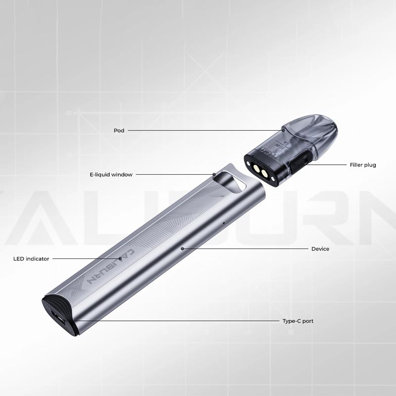 Der Caliburn A3S Pod Stick verfügt über einen integrierten 520 mAh Akku mit hoher Ausdauer. Dank des USB Typ-C-Anschlusses kann er mit bis zu 2A Ladestrom schnell aufgeladen werden. Die maximale Ausgangsleistung beträgt 16 Watt und wird automatisch an den verwendeten Pod angepasst. Die Bedienung ist einfach: Ein Zug am ergonomisch geformten Mundstück des Pods genügt, um das geschmacksintensive Dampferlebnis zu starten. Die mehrfarbige LED-Anzeige in Form des Caliburn-Logos informiert detailliert über den Akkustand, den Betriebsstatus und den Ladefortschritt des Kits. Das Caliburn A3S Kit bietet auch alle relevanten Schutzschaltungen für ein sicheres Dampfen ohne Einschränkungen.