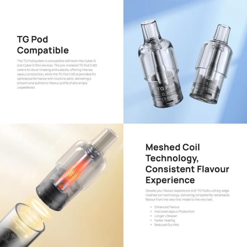Im Cyber G Slim Kit von Aspire kommen erneut die speziell für die Cyber G Reihe entwickelten TG Pods aus transparentem PCTG zum Einsatz. Mit den festverbauten 1,0 oder 0,8 Ohm KA AF Mesh Coils eignen sie sich perfekt für ein klassisch-strenges sowie gemütlich-lockeres Mund-zu-Lunge-Dampfen. Die integrierten Mesh Coils verwandeln die bis zu 3,0 ml Liquid, die über das Side-Fill schnell und sicher ins Innere der Pods gelangen, bei jedem Zug in weichen und äußerst geschmacksintensiven Dampf. Das integrierte Drip Tip ist ein wahrer Lippenschmeichler. Die Pods werden von starken Magneten sicher auf dem Cyber G Slim Pod-Mod fixiert und können am Ende der Coil-Lebensdauer einfach durch einen neuen Pod ersetzt werden.