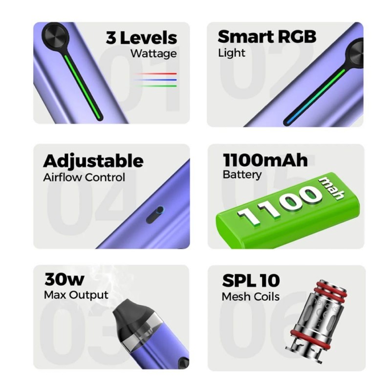 Dank des integrierten 1100 mAh Akkus, der über den seitlichen USB Typ-C Anschluss mit bis zu 2A Ladestrom schnell aufgeladen werden kann, bietet das S30 Kit eine beeindruckende Ausdauer bei einer maximalen Ausgangsleistung von 30 Watt. Der moderne Chipsatz erkennt automatisch die verwendete SPL-10 Mesh Coil und passt die Leistung optimal an den Coilwiderstand an. Es stehen drei Leistungsstufen (Low, Medium, High) zur Verfügung, um das geschmacksintensive Dampferlebnis individuell zu gestalten. Die Aktivierung kann über die integrierte Zugautomatik oder den ergonomischen Feuerbutton erfolgen. Der Feuerbutton schaltet das System ein bzw. aus (5-Klick) und wählt die Leistungsstufe aus (3-Klick). Ein LED-Balken am Feelin 2 Mod sorgt nicht nur für stimmungsvolle Lichteffekte in verschiedenen RGB Farben, sondern zeigt auch den Betriebsstatus, den Akkustand (oberer Teil) und die gewählte Leistungsstufe (unterer Teil) an. Umfangreiche Schutzschaltungen, einschließlich 10-Sekunden Overtime-Protection, gewährleisten einen sicheren Betrieb des Nevoks Pod-Systems.