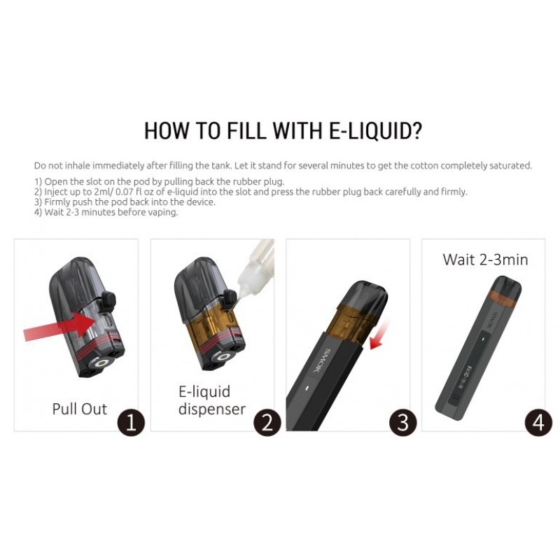 Die transparent-abgedunkelten Pods des Nfix Pro Pod Kits bieten ein Tankvolumen von 2ml und besitzen ein praktisches SideFilling. Entfernt man an der Seite einen Silikonstutzen, so eröffnet sich ein großes Befüllloch, über das das Liquid bequem nachgetankt werden kann.