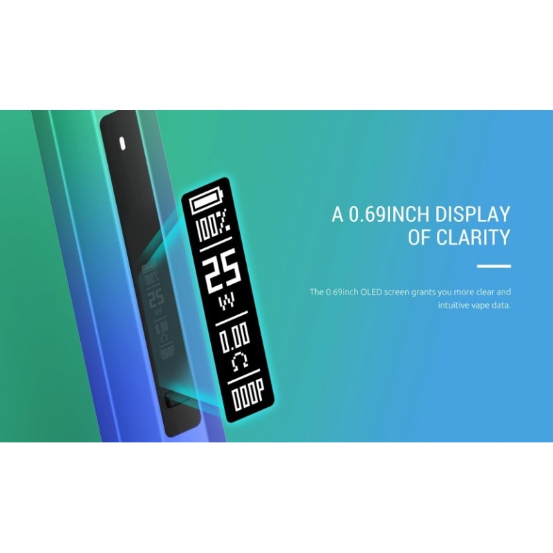 Allerdings besitzt das Nfix Pro Pod Gerät einen Powerbutton. Über diesen wird das Gerät ein- und ausgeschaltet, zusätzlich lässt sich hierüber die Ausgangsleistung von 5-25 Watt einstellen. Ein kleines, aber fein auflösendes 0,69" OLED Display macht die Einstellung zu einem Kinderspiel und zeigt darüberhinaus Informationen zum aktuellen Akkustand, der eingestellten Leistung sowie dem Widerstand des Coils an. Zusätzlich ist noch ein Zugzähler mit an Bord, über den das Dampfverhalten überwacht werden kann. Darüberhinaus besitzt das Nfix Pro Pod Gerät noch eine LED, die zusätzlich über den Betriebszustand des Nfix Pro Sticks informiert.