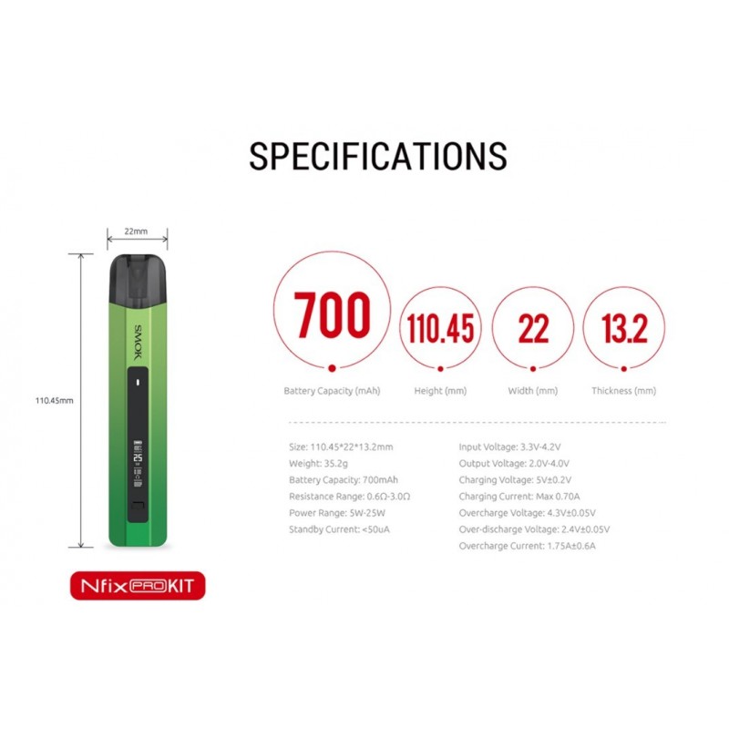 In das Nfix Pro Pod Kit hat Smok grundsätzlich alles kompakt in einem Gerät verbaut, was man von einer ordentlichen E-Zigarette erwartet. Ein 700mAh großer Akku sorgt für die Ausdauer sowie eine Ausgangsleistung von 5 bis 25 Watt im klassischen VW- bzw. Powermodus. Das Nfix Pro Pod Kit besitzt keinen Feuerbutton. Eine integrierte Zugautomatik sorgt dafür, dass an dem Gerät einfach gezogen werden kann - der Verdampferungsprozess wird automatisch ausgelöst.