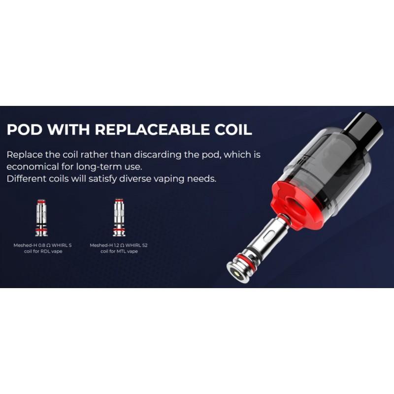 Das Whirl 2S Kit ist ein Podsystem, bei dem die Kerne via einfachem Push'n'Pull-System auswechselbar sind. Neben einem Coil mit 1,2 Ohm Widerstand, der ausschließlich für restriktiveres Dampfen (MTL, zigarettenähnlich) konzipiert wurde, gibt es mit dem Coil mit 0,8 Ohm Widerstand noch einen Kern, der auch für den restriktiven Shishaeinsatz geeignet ist (RDL, Shishaähnlich). Mit der von UWell bekannten und patentierten "PRO-FOCS Flavor Adjustment Technology" und neuester Meshtechnik sind bei beiden Coils ein großartiges Dampferlebnis garantiert.