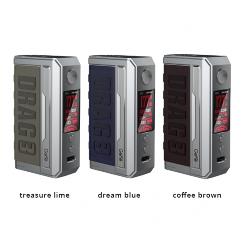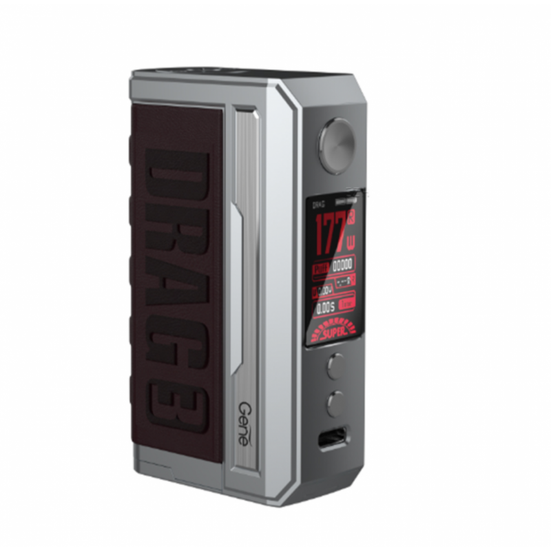 Der Drag 3 Akkuträger wurde optisch überarbeitet, hat aber in etwa diesselben Maße und denselben Style wie der Argus GT. Bestehend aus einer Zinklegierung und griffigem Leder liegt der Drag 3 Box Mod Akkuträger ergonomisch in der Hand und fühlt sich sehr leicht an, obwohl er es mit zwei wechselbaren 18650 Akkus aufnimmt. Mit dem neuen Advanced GENE.FAN 2.0 Chipsatz leistet der Drag 3 Mod nun bis zu 177 Watt. Darüberhinaus bringt er einige neue Features mit - neben den klassischen VW- oder TC-Modi zum temperaturgesteuerten Dampfen ist auch ein Smart-Modus an Bord, der den eingesetzten Kern (Coil, Head) automatisch erkennt und entsprechend die Leistung einstellt. Ein RBA Modus erlaubt dem Benutzer, noch weiter in die Einstellungen einzugreifen. Ein High Burst Super Mode sorgt dafür, dass der Drag 3 Mod nochmals schneller feuert.