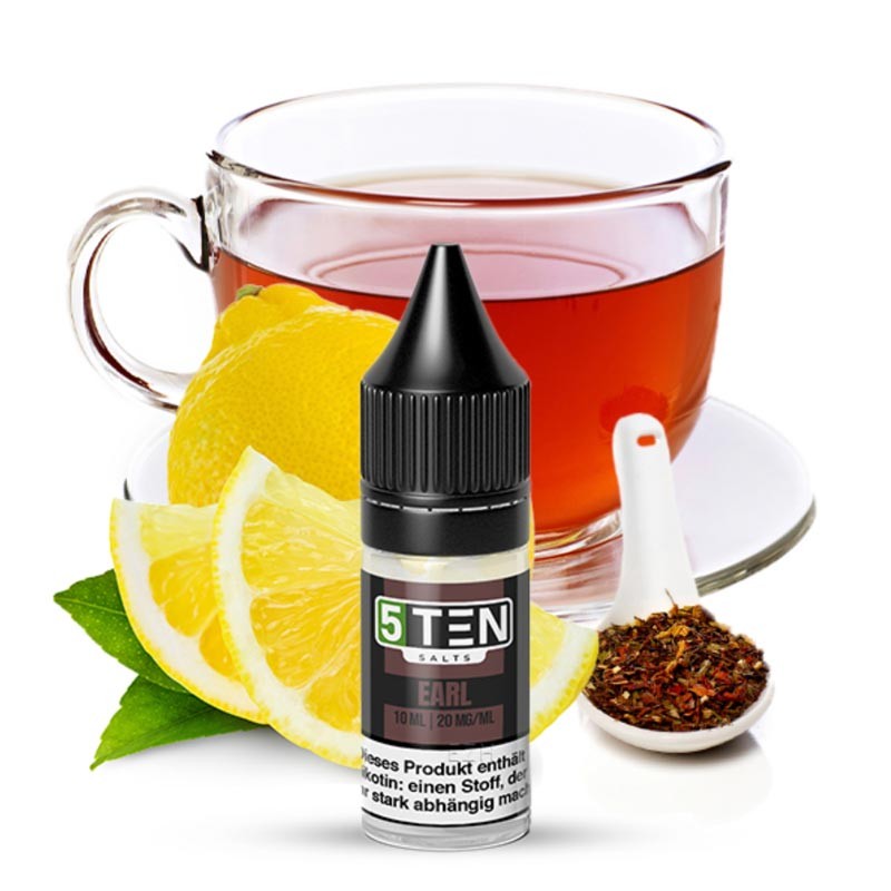 Die Experten von 5 Ten laden zu einer entspannten Tea-Time ein und präsentieren ihr Nikotinsalz-Liquid "Earl", eine exklusive Teesorte direkt aus dem Tank Deiner E-Zigarette. Earl Grey ist weltweit einer der beliebtesten Teesorten und besticht durch sein erfrischendes Zitrusaroma, das von Bergamotteöl stammt. Diese Teespezialität ist eine perfekte und sanfte Erfrischung, die auch an heißen Tagen kalt genossen werden kann. 5 Ten veredeln ihren Earl Grey Tee mit einigen Spritzern frischer Zitrone, die die natürlichen Zitrusnoten des Tees unterstreichen und die Geschmacksnerven erwecken. Ein absolut erfrischendes Teeerlebnis!