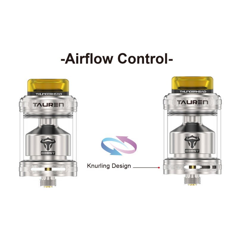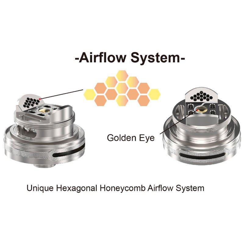 Eine Honeycomb-AirFlow (mit Wabenstruktur) lässt die Luft von zwei Seiten auf die Wicklung(en) treffen. Zusätzlich sorgt ein "Golden Eye" - eine Öffnung unterhalb der Wicklung(en) für zusätzlichen Luftzufluß. Dadurch kann man sich schon denken, dass der Tauren Beest RTA einen mehr als ordentlichen Durchzug bietet und für sehr guten Geschmack und eine außergewöhnliche Dampfqualität auch von der Dichte her sorgen wird.