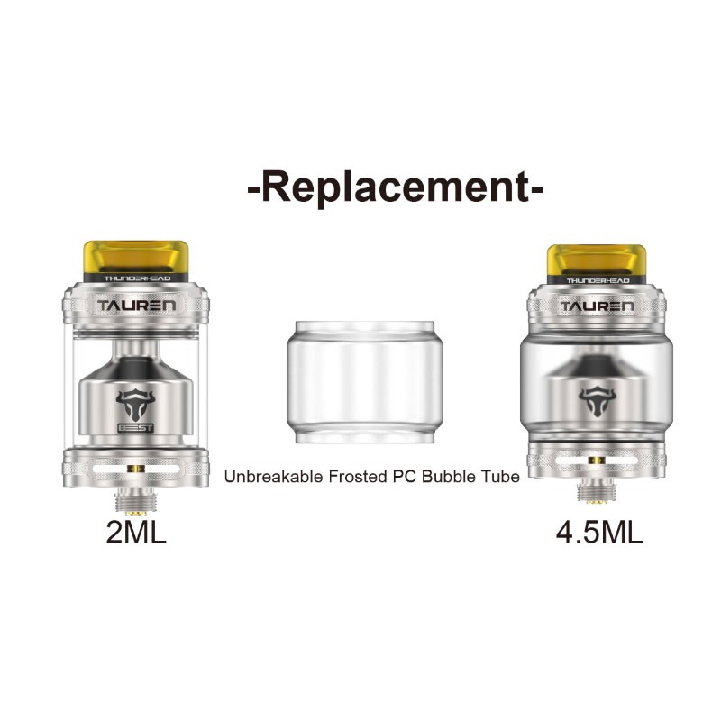 Im Auslieferungszustand ist der Tauren Beest mit einem geraden Glas ausgestattet und bringt es so auf 2ml Tankvolumen. Ein beiliegendes Bubble-Glas (Bauchglas) im Frosted-Design kann alternativ verwendet werden, wodurch man es auf 4,5ml Volumen bringt.