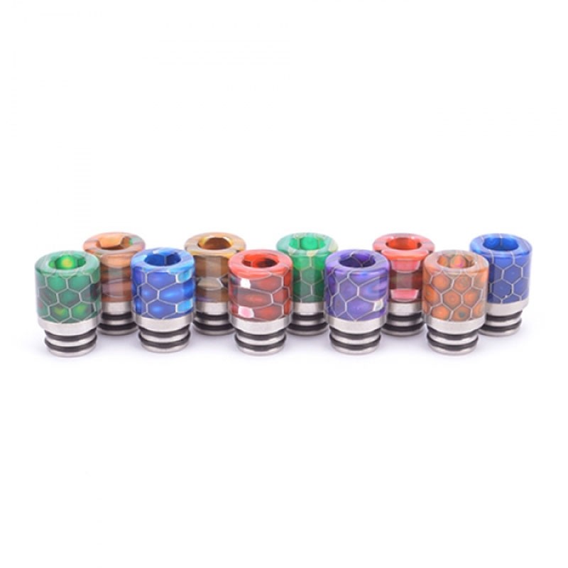 Hier erhältst Du ein DripTip (Mundstück) für Deinen Verdampfer im 510er-Format. Die Aufnahme des hier angebotenen DripTip ist aus Edelstahl, das Mundstück an sich aus farbenfrohem Epoxidharz. Dadurch ist das DripTip vom Design her stylisch gehalten und bringt aber mit der Edelstahl-Aufnahme auch einen kleinen Kühleffekt mit. Das Wabenmuster sieht modern aus und jedes DripTip kommt in mehrfabrigem Muster.