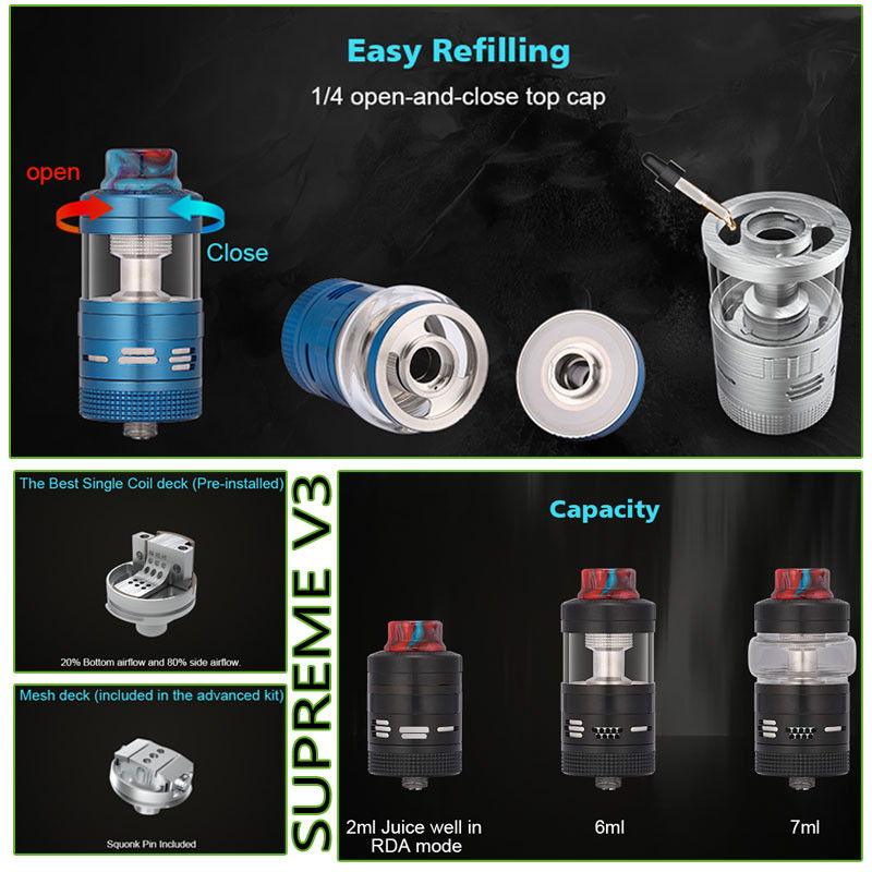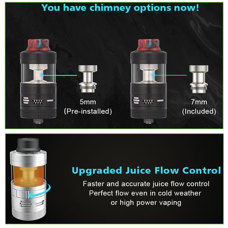 Wie bereits auch die Vorgänger ist der Aromamizer Supreme V3 RDTA eher auf einen offenen Zug ausgelegt. Die neue und verbesserte AirFlow Control kann nun noch präziser eingestellt werden und erlaubt nun auch einen etwas restriktiveren Zug. Zwei unterschiedliche Kamine (beide enthalten) mit 7mm und 5mm Durchmesser bieten eine zusätzliche Eingriffsmöglichkeit in die Luftstromoptimierung. Zudem sorgen neue Fräsungen am AirFlow-Ring sowie die Möglichkeit, diesen umgedreht aufzusetzen, für noch mehr Luftspielerei.
