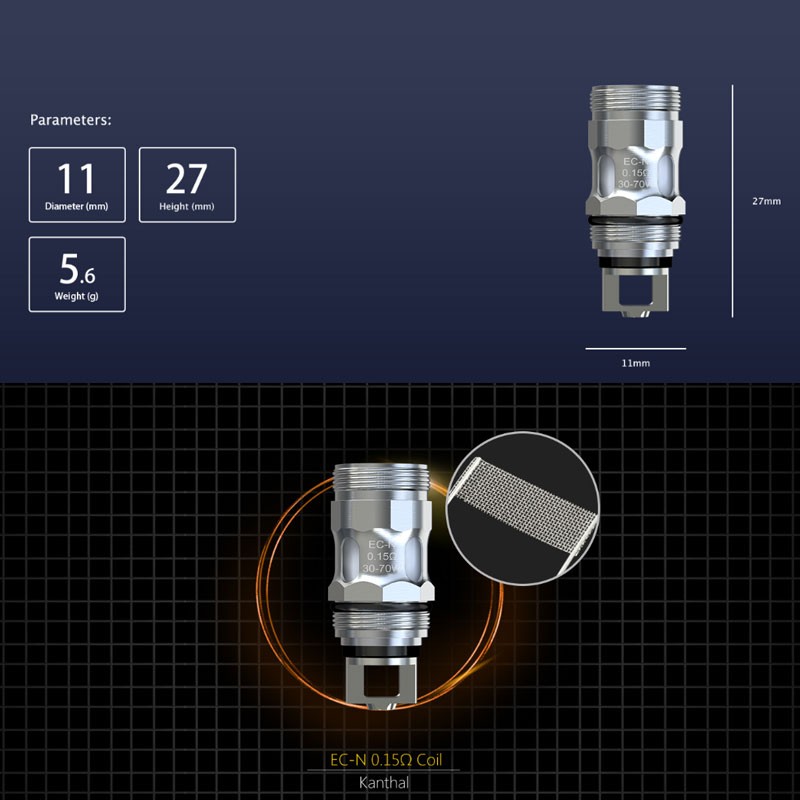 Hier erhältst Du die neuen Coils aus der EC-Serie von Eleaf. Damit gibt es nun erstmals Kerne mit Meshtechnik für die weltweit erfolgreiche Verdampferserie von Eleaf. Der EC-M und der EC-N sind beides Varianten mit Mesh (Net & Multihole) aus Kanthal. Der EC-S Kern hat als Heizelement ebenfalls Mesh verbaut, nutzt aber Edelstahl (SS316) als Material und ist damit auch für die Temperatursteuerung geeignet.