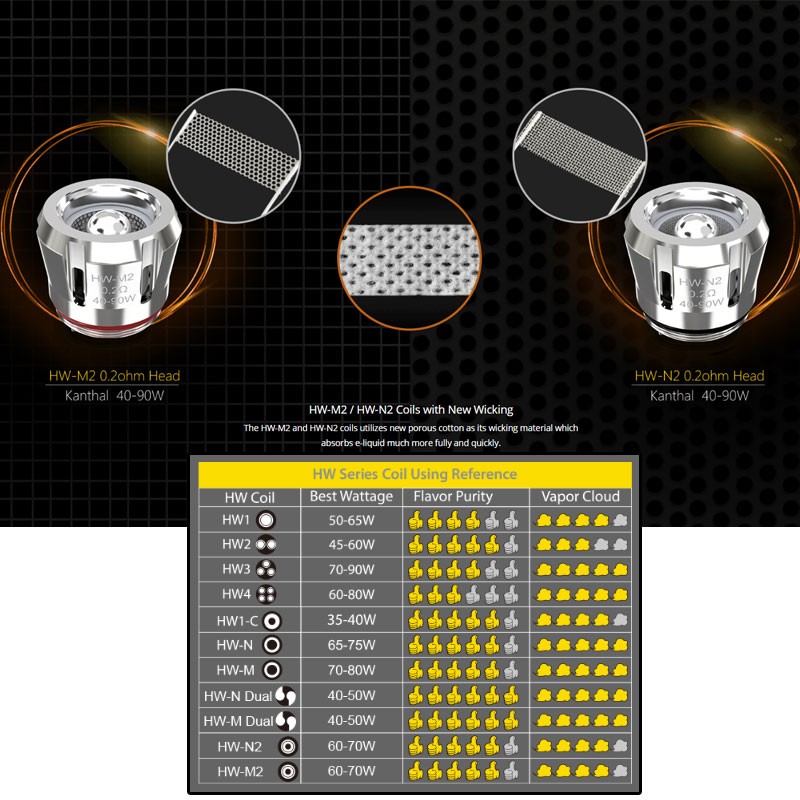 - HW-M: Kanthal Multihole Coil mit 0,15 Ohm für 50-100 Watt (Best 70-80W)
