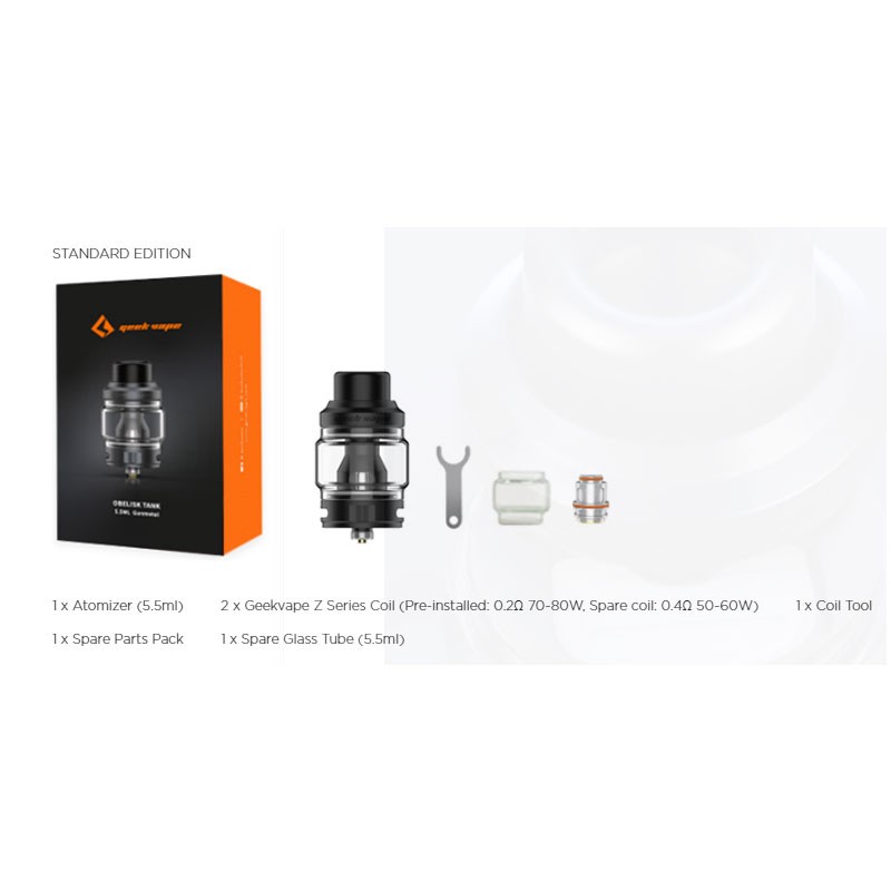 Der Obelisk Tank Kernverdampfer arbeitet mit den beliebten und geschmacks- und dampfstarken Z Coils von Geekvape. Wie beim Z Subohm werden diese auch von unten eingesteckt (Push'n'Pull), wodurch der Coilwechsel innerhalb kürzester Zeit problemlos erledigt ist. Im Lieferumfang liegt sowohl der Z1 (0,4 Ohm 50-60W) wie auch der Z2 (0,2 Ohm 70-80W) mit bei.