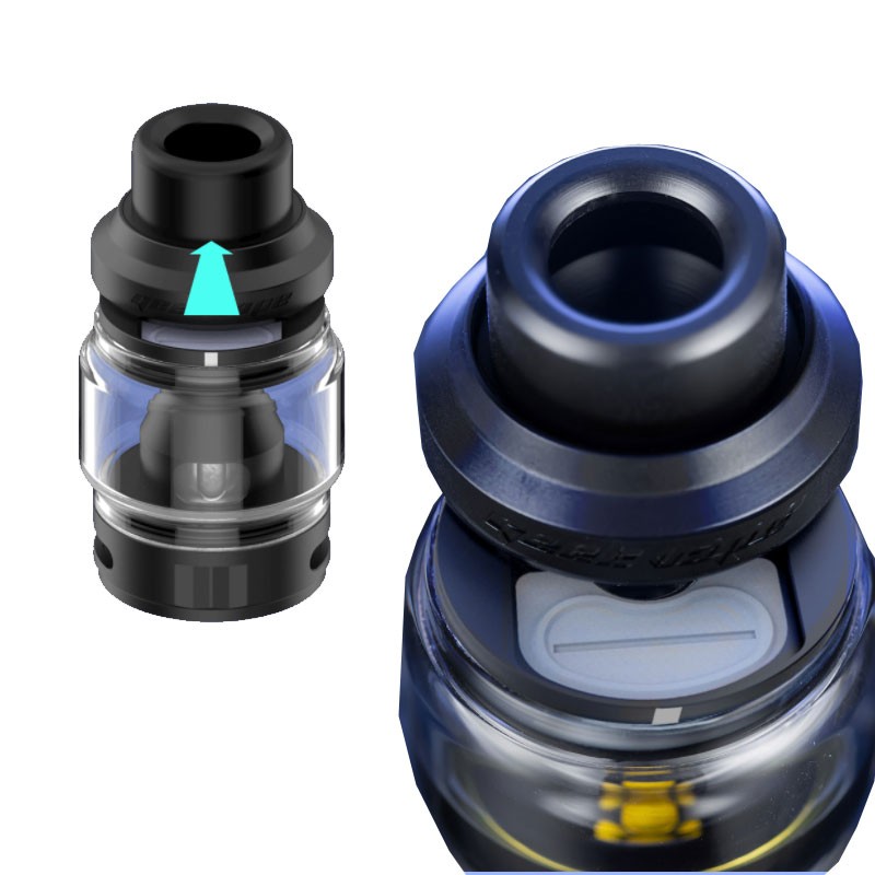 Der Obelisk Tank Kernverdampfer kommt im Auslieferungszustand mit einem Bubbleglas, mit dem er Dir satte 5,5ml Tankvolumen anbietet. Befüllt wird er durch ein kindersicheres Slide-to-open-Prinzip. Zunächst wird dabei die TopCap etwas angehoben, so dass sie dann zur Seite geschoben werden kann. Dadurch öffnet sich ein großes Befüllloch, mit dem man mit jeder Flaschen- und Nuppelgröße komfortabel nachfüllen kann. Dies zeigt sich im Alltag auch als Vorteil gegenüber dem Z Subohm Tank - man hat einfach nicht noch die TopCap in der Hand oder muss sie zur Seite legen, da diese beim Obelisk Tank oben auf dem Verdampfer verbleibt.