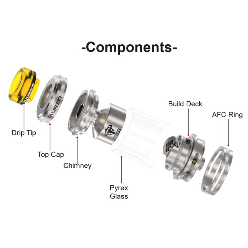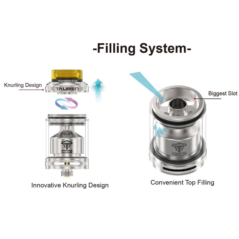 Eine Honeycomb-AirFlow (mit Wabenstruktur) lässt die Luft von zwei Seiten auf die Wicklung(en) treffen. Zusätzlich sorgt ein "Golden Eye" - eine Öffnung unterhalb der Wicklung(en) für zusätzlichen Luftzufluß. Dadurch kann man sich schon denken, dass der Tauren Beest RTA einen mehr als ordentlichen Durchzug bietet und für sehr guten Geschmack und eine außergewöhnliche Dampfqualität auch von der Dichte her sorgen wird.